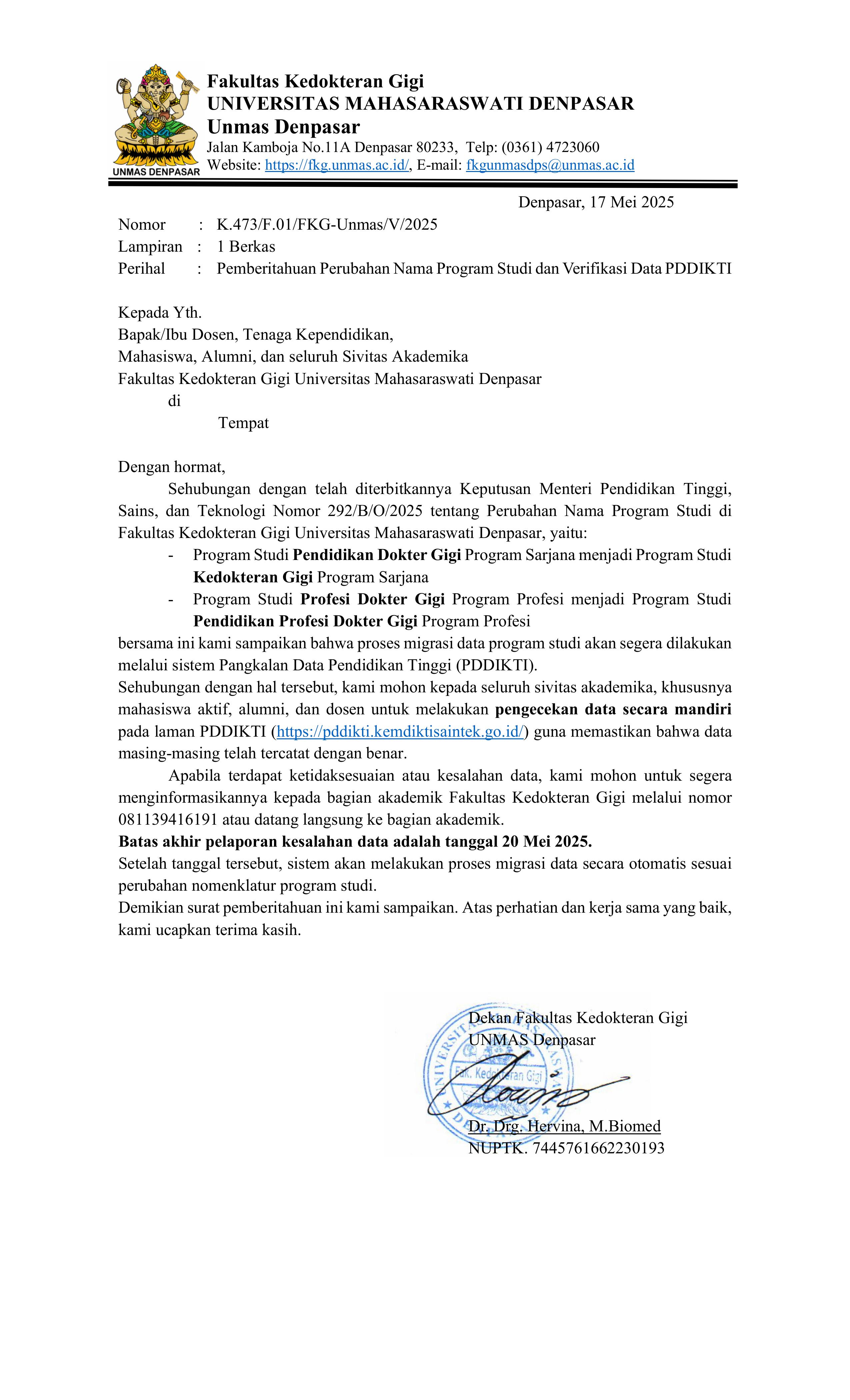 Kamis 27 Juni 2024, Fakultas Kedokteran Gigi Universitas Mahasaraswati Denpasar telah melaksanakan kuliah pakar kali ini mengundang dua pembicara yakni Hiroe Ohyama, DDS., MMSC., Ph.D., DMD dengan topik “Future Dental Education” dan Prof. Cortino Sukotjo, DDS., Ph.D., MMSC., MPHE dengan topik “Artificial Intelligent in Dentistry” yang bertempat di ruang nakula sahadewa fkg unmas denpasar. Kuliah pakar ini dihadiri oleh dekan, wakil dekan I, wakil dekan II, Kaprodi profesi, dosen dan mahasiswa/i di lingkungan fakultas kedokteran gigi universitas mahasaraswati denpasar. Selama kuliah pakar berlangsung, mahasiswa/i sangat antusias mengikutinya dan acara ditutup dengan pemberian kenang-kenangan serta foto bersama.